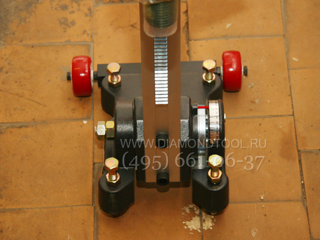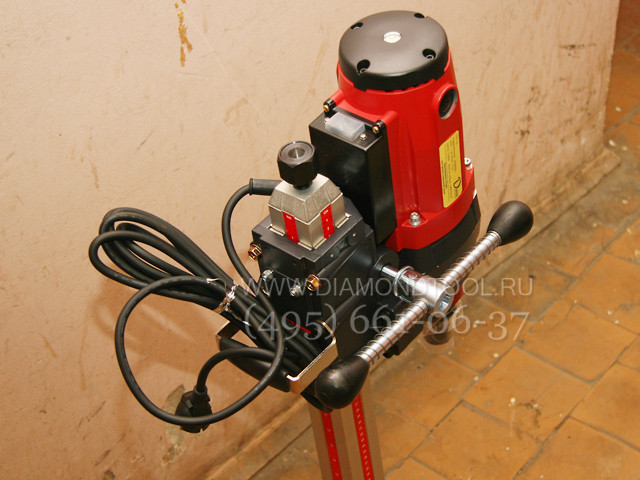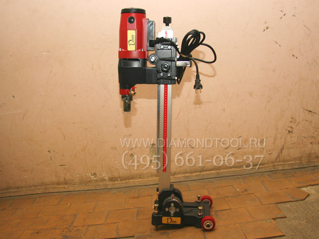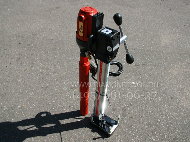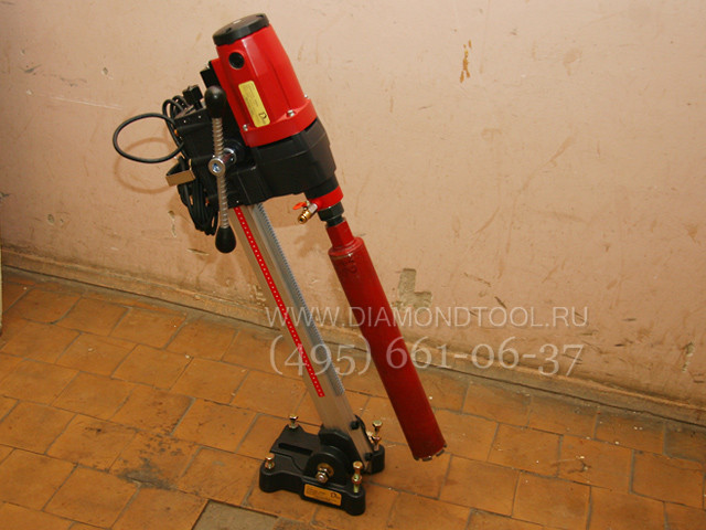 Прочная стальная сверлильная стойка является особенностью данных моделей алмазных установок, быстросъемное соединение сверлильной стойки и мотора, наличие редуктора для плавной подачи алмазной коронки. Отличительными особенностями является то, что сверлильная алмазная установка легко и быстро собирается и разбирается, регулировка наклона и настройка станины производится без использования специального инструмента. Данная модель электродвигателя со встроенной электронной системой защиты, для алмазного сверления отверстий до диаметра 160 мм. Соединительный хвостовик двигателя алмазной установки - универсальный, имеет внешнюю резьбы 1 1/4" и внутреннюю резьбу 1/2", т.е. подходит для алмазных коронок любых производителей.