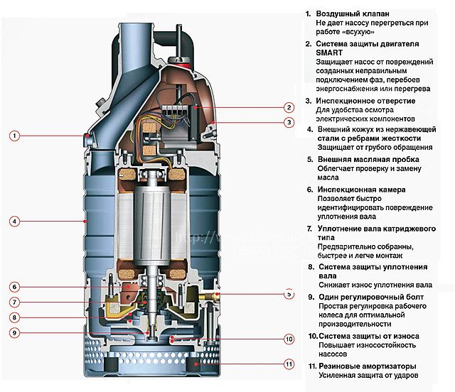 - Система защиты двигателя SMART, защищает насос от повреждений при неправильном подключении фаз, перебоев энергоснабжения и перегрева.