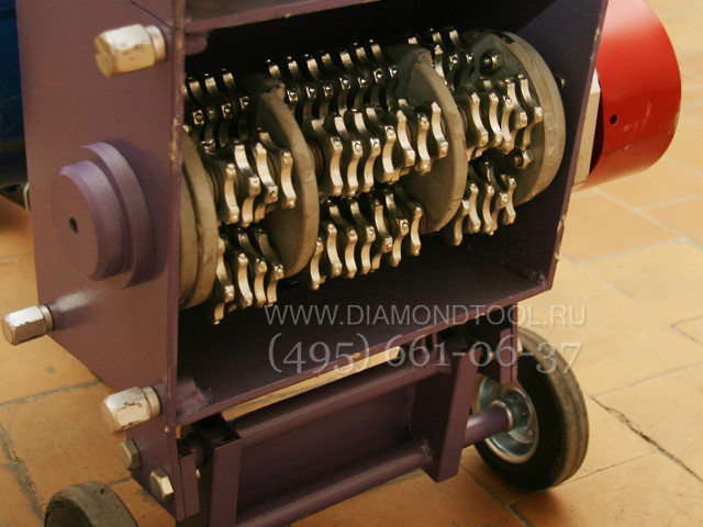 Принцип работы фрезеровальной машины: фрезеровальная головка (барабан) вращается электрическим или бензиновым двигателем. На барабане установлены направляющие с ламелями (звездочками). При вращении фрезы, под действием центробежной силы звездочки бьются о поверность пола и сбивают верхние слой.