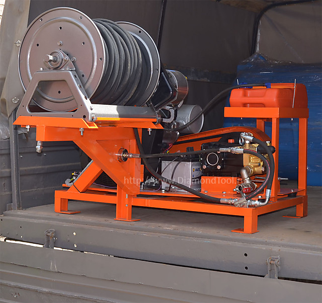 Гидродинамическая установка, работающая при помощи бензинового привода Kohler с электростартером мощностью 36 л/с. Конструкция состоит из бака для воды емкостью 1000 литров, катушки с шлангом высокого давления длиной до 80 метров и насоса высокого давления UDOR, приводимого в действие при помощи бензинового двигателя. Эти элементы смонтированы на прочной раме, которая помещается на любой автомобильный кузов или прицеп. Установка предназначена для прочистки каналов и труб диаметром до 1200 мм. Под заказ на данный агрегат можно установить бак для воды большего объема и насос 200 бар с потоком 55 л/мин.