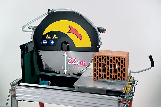 Камнерезный станок для работы на строительных объектах, существенно упрощает обработку камня, кирпича, мрамора и поротона. Электрический трехфазный мотор мощностью 4 кВт позволяет использовать диски диаметром до 500 мм и разрезать блоки высотой до 170 мм в один проход и блоки высотой до 235 мм в два прохода.