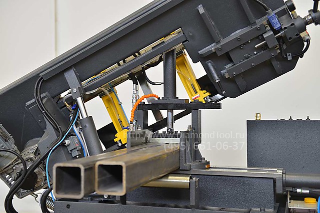 - Конструкция станка имеет отличительные особенности в зависимости от назначения модели (второй гидроцилиндр на опускание пильной рамы, гидравлический привод перемещения губок тисков в зависимости от положения пильной рамы, дополнительные вертикальные направляющие, автоматическая регулировка высоты подъема пильной рамы, педаль оператора и др.).